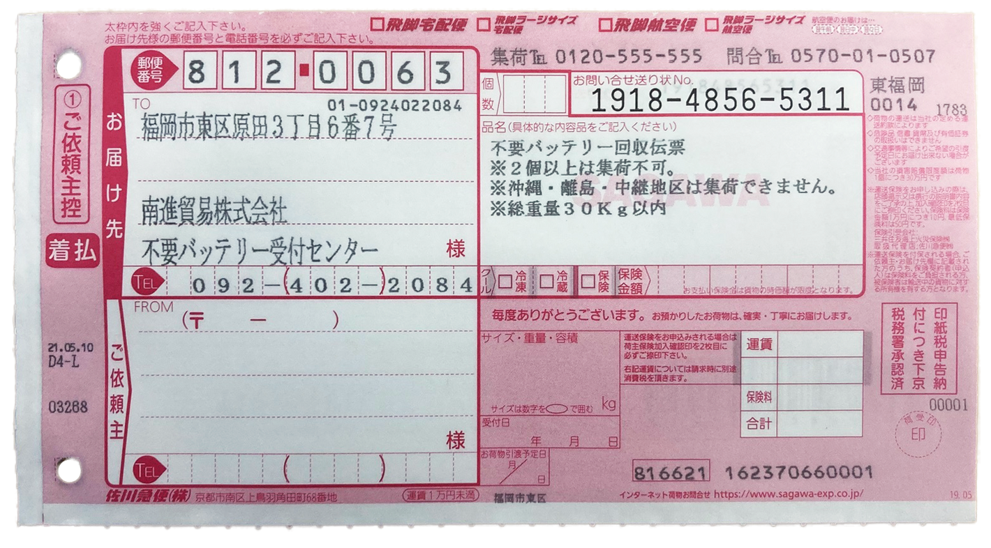 (最寄りの佐川急便営業所にお客様ご自身でお持ち込みも可能です。※別途費用は掛かりません)