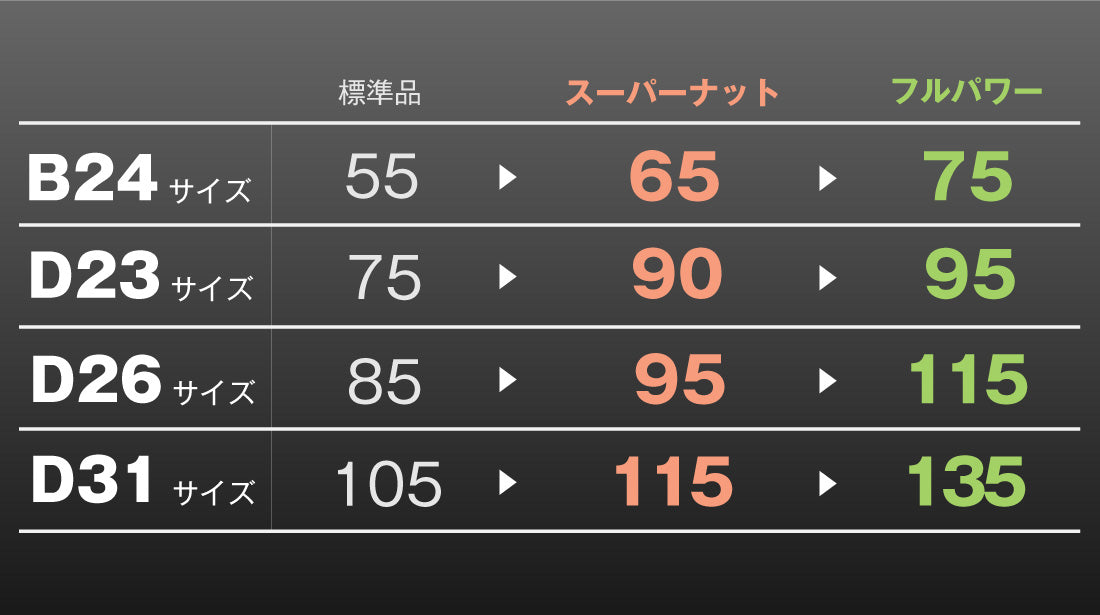車内で様々な電子機器をお使いの方は、なるべく容量の大きなバッテリーをお選びください。スーパーナット / フルパワーのバッテリーなら、どのサイズを選んでも標準以上の大容量で安心してお使い頂けます。